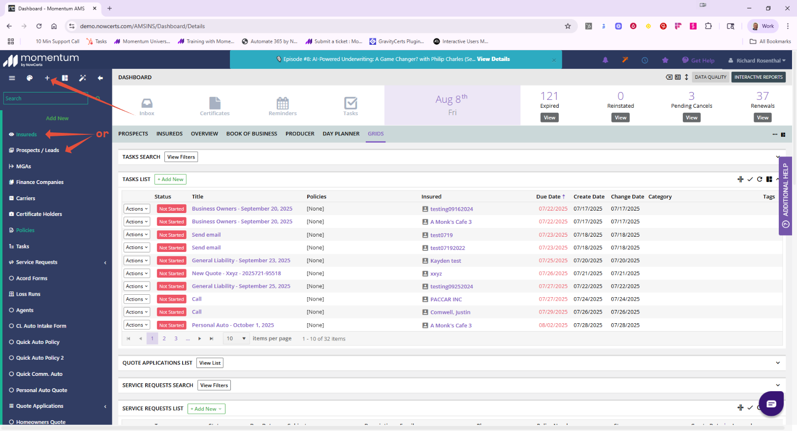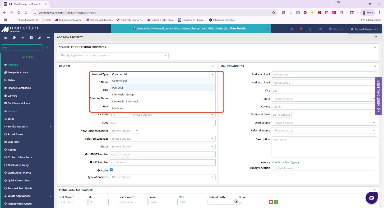 In Momentum AMS, creating a Prospect or Insured record is the first step in tracking leads, quoting, issuing policies, and managing ongoing client relationships. This record becomes the central hub for all related data — including opportunities, quotes, insured items, documents, notes, and tasks.