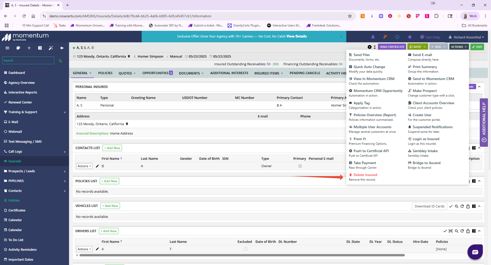 Select “Delete” (the label may show as “Delete Prospect” or “Delete Insured”)