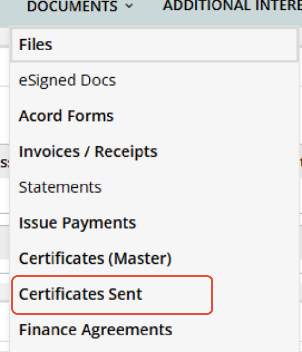 All certificates — whether sent manually, in bulk, or via an additional interest — are stored under the insured’s Documents tab.