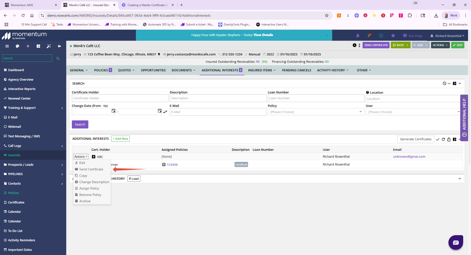 Once policy coverage is verified, you can send the certificate to either a Certificate Holder (standard third party) or an Additional Interest (named on the policy). Both processes are done directly from the insured’s profile, using the proper workflow based on the holder type.