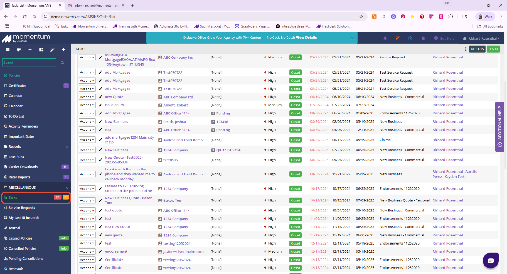 In Momentum AMS, Tasks are action items used to track and manage specific to-do items associated with a policy, insured, quote, or internal workflow. Unlike Service Requests, which are often submitted by clients or external users, Tasks are primarily internal and serve as the foundation of agency operations and accountability.