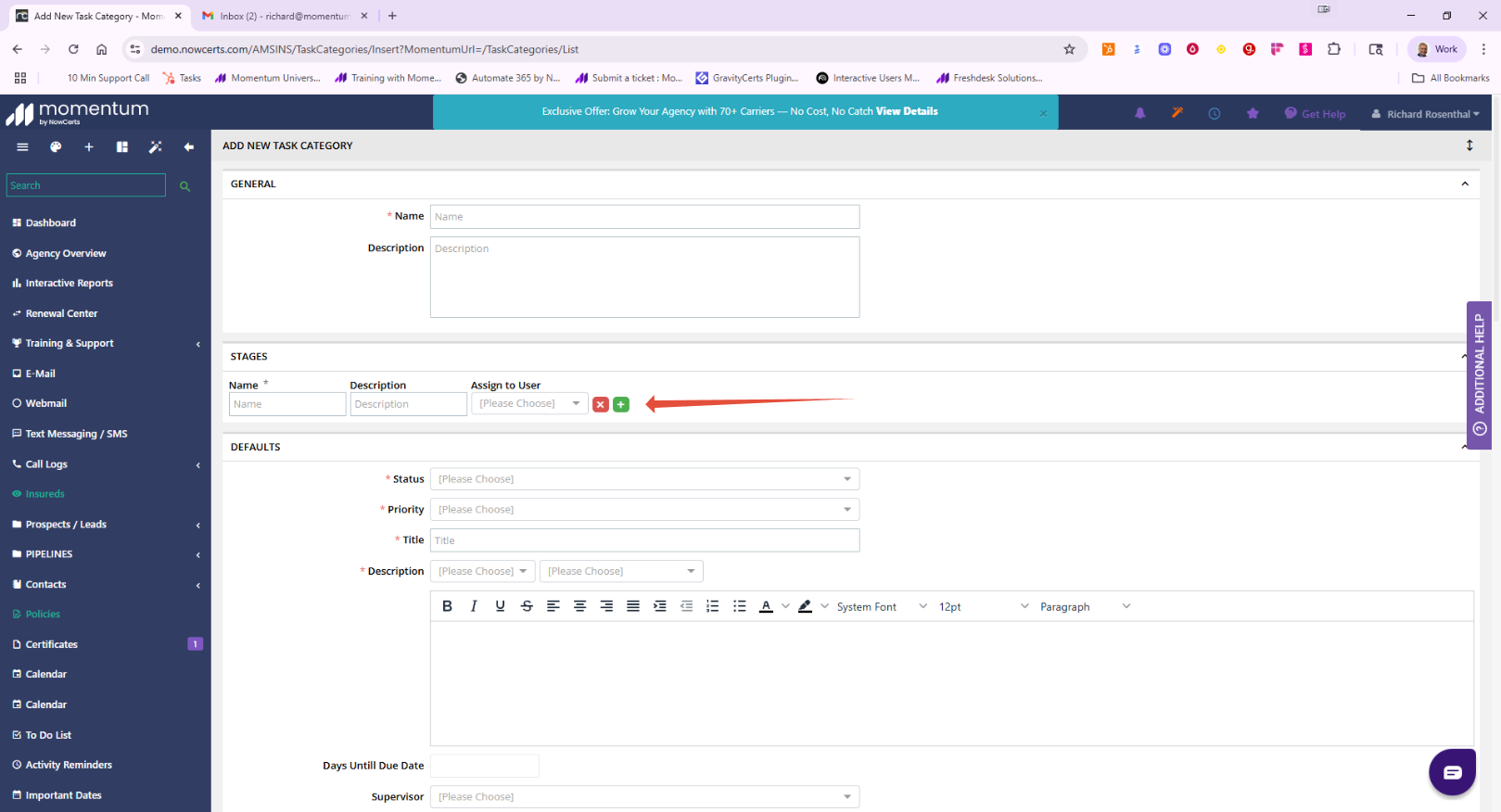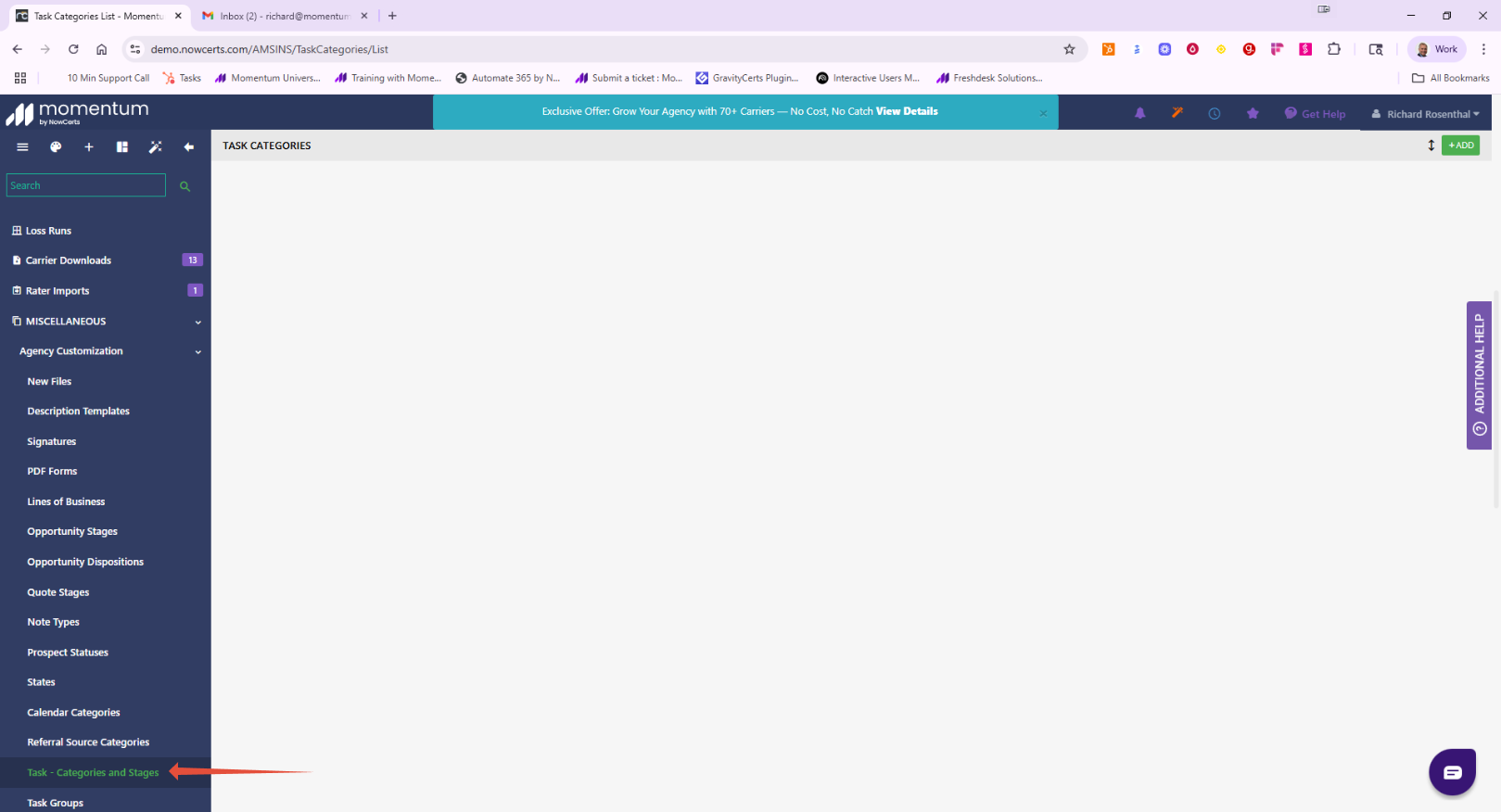 Task Categories and Stages in Momentum AMS allow your agency to create workflow pipelines that match your internal processes. Whether you're managing onboarding, renewals, endorsements, or claims, this customization helps teams stay organized and accountable.