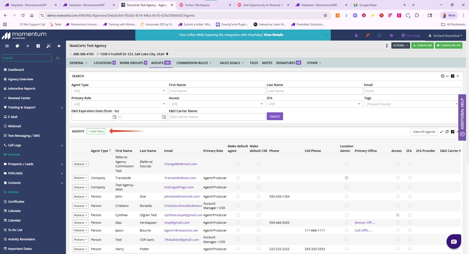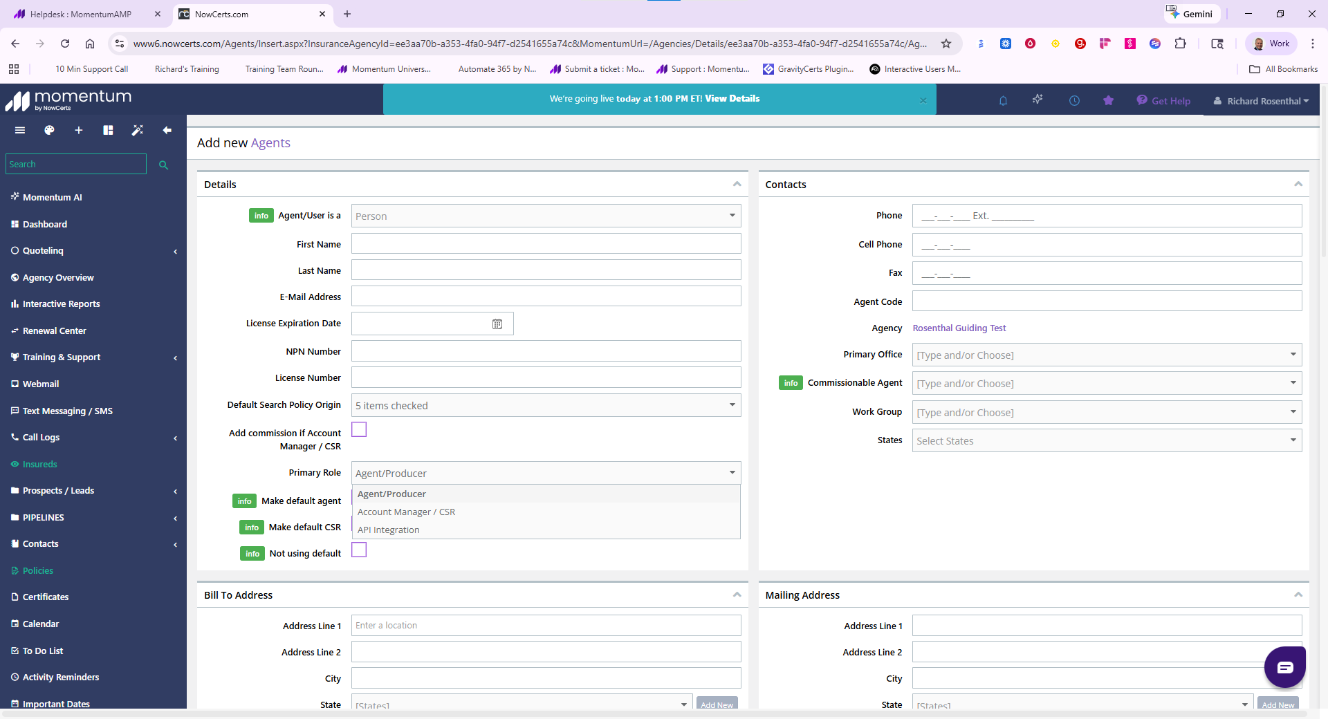 • Agents are records used for commission tracking, assigning producers/CSRs, and reporting purposes.