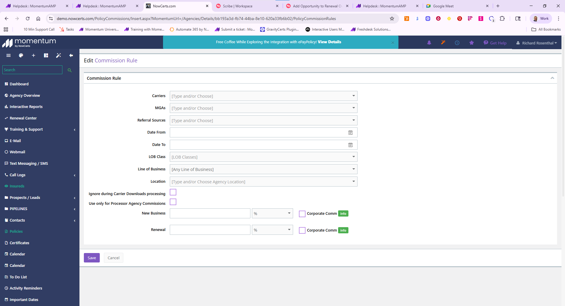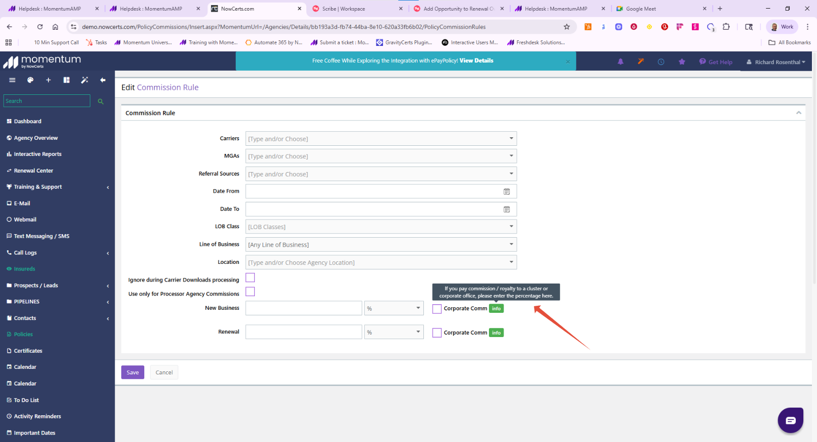 Corporate Commission Info – Appears to the right of the New Business and Renewal fields. Use this if your agency’s commissions are split with an aggregator or cluster (e.g., SIAA, SmartChoice). This field lets you record or calculate the corporate/parent organization’s share separately from your agency’s retained commission. This allows you to build in the split you have with that aggregator and calculate your actual commission.