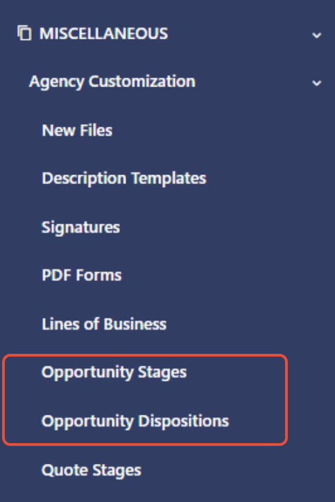 In Agency Customization, you can set up either Opportunity Stages (the steps in your sales process) or Opportunity Dispositions (the reasons opportunities are won or lost).