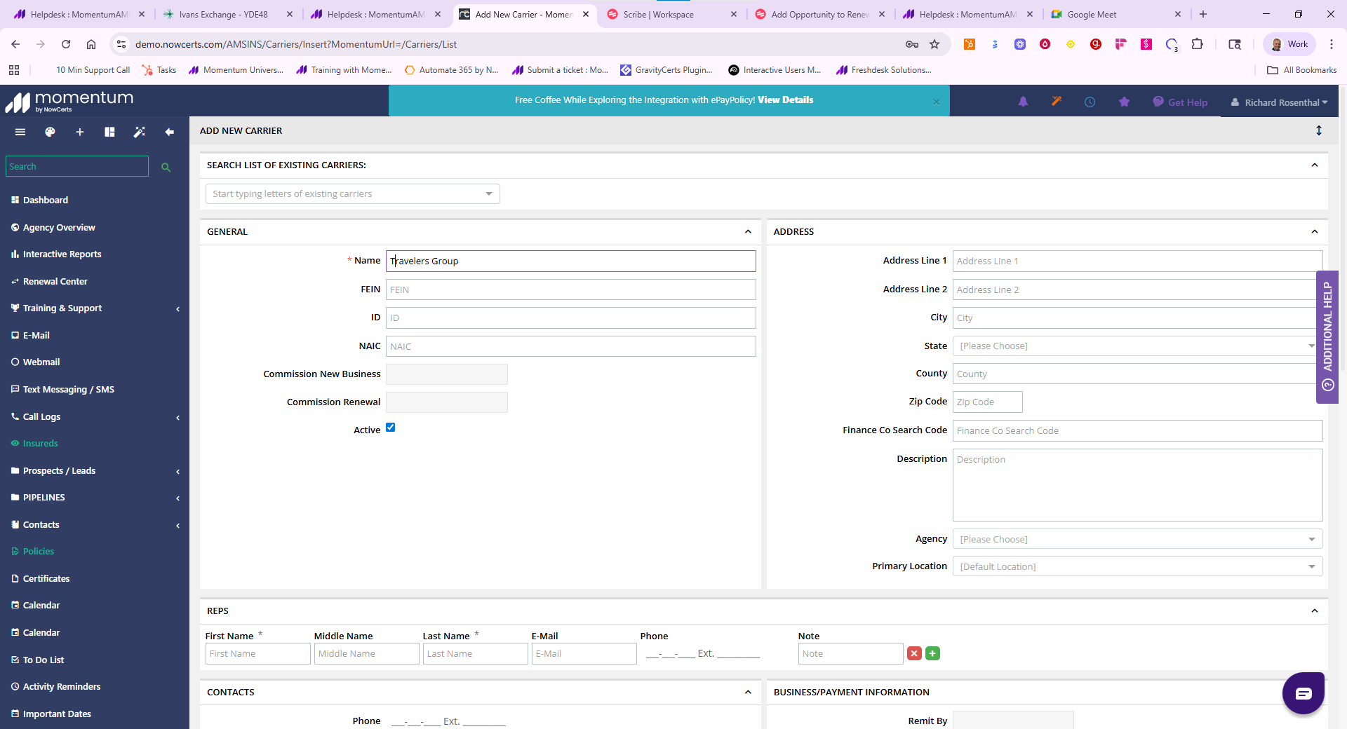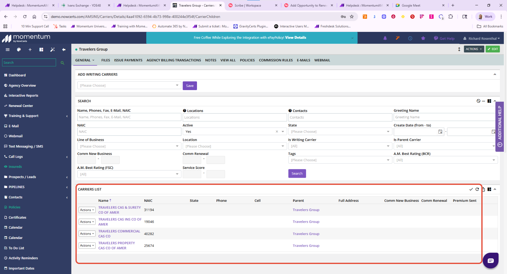 Some insurance groups — such as Travelers, Progressive, or Safeco — operate multiple writing companies under the same parent brand. In Momentum AMS, you can group these related carriers under a Parent Carrier record.