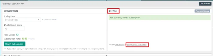 Within the billing page, locate the link labeled Change Credit Card Details.