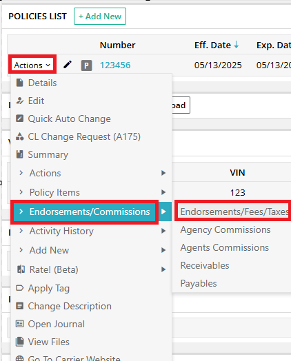 From the policy, click Actions → Endorsement/Commissions → Endorsement/Fees/Taxes.