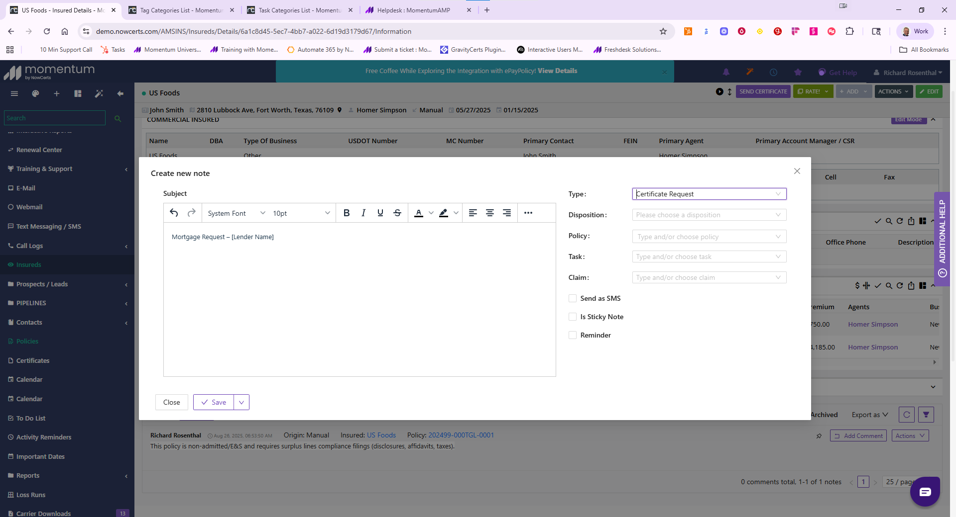 Apply tags for tracking: Since you cannot add notes to certificate holders, use tags such as “Mortgagee – Residential”, “Mortgagee – Escrow Required”, or “Mortgagee – Commercial” to categorize.