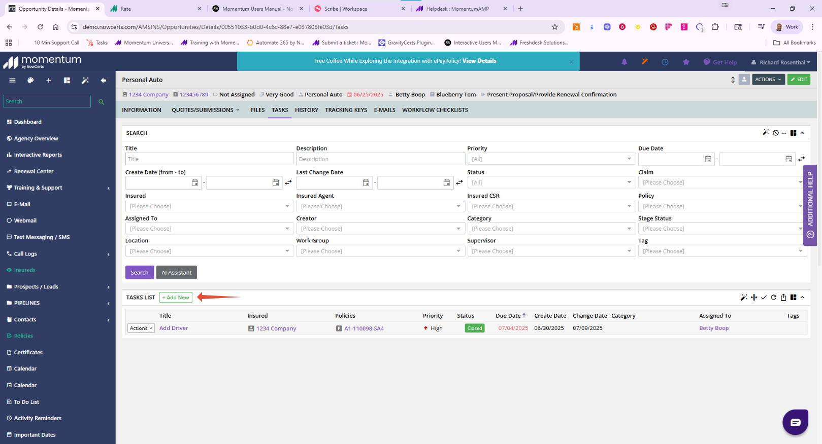 The New Business Lead Management workflow in Momentum AMS provides a structured way to capture, evaluate, and advance new leads through the sales process. By leveraging Quotelinq/Ratelinq and the Opportunity tools in AMS, agencies can ensure leads are logged properly, qualified against appetite, and moved into quoting with accurate documentation.