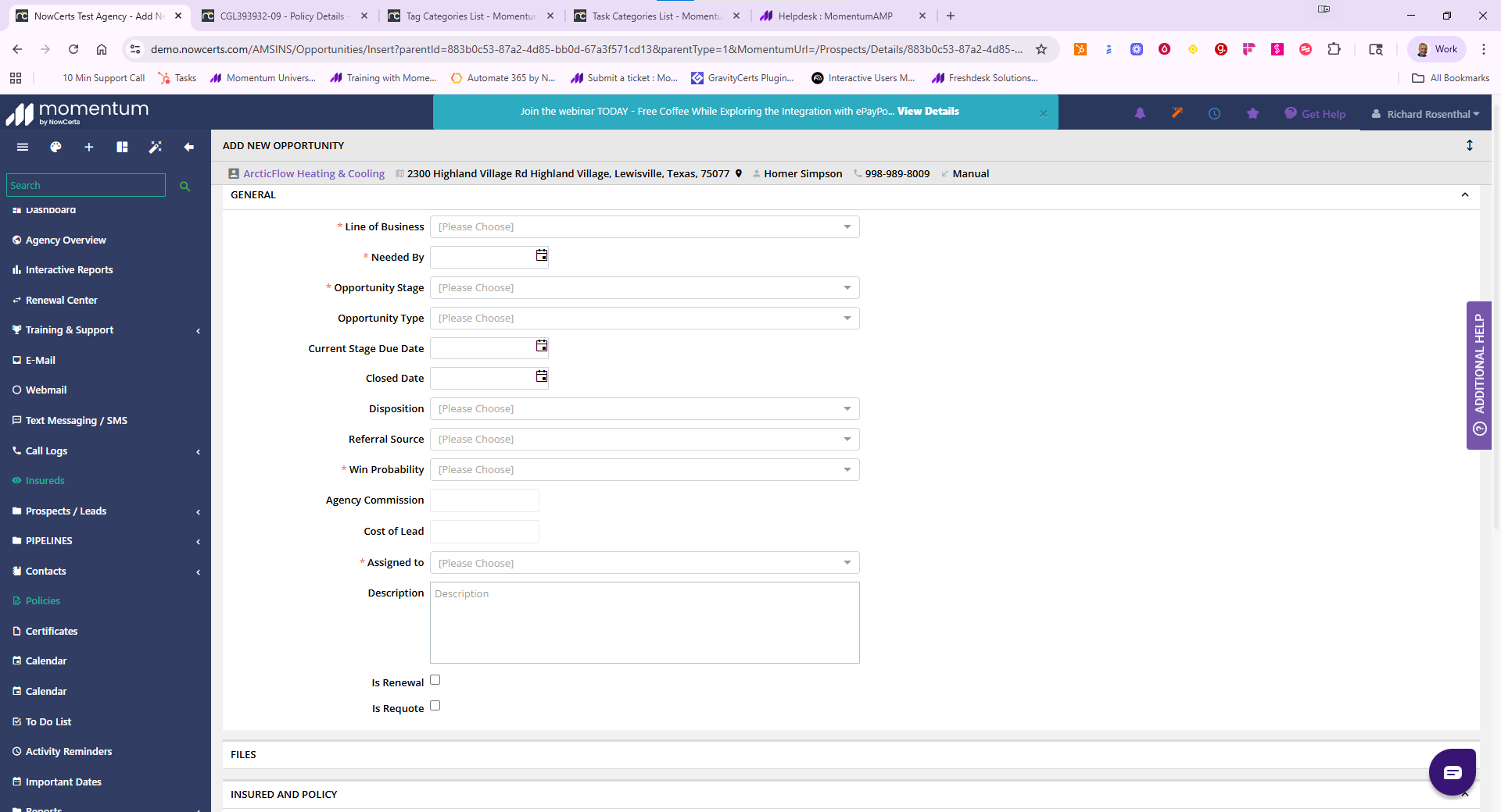 The New Business Quoting workflow in Momentum AMS guides you through creating a prospect, gathering information, reviewing carrier eligibility, preparing proposals, and binding coverage. This ensures accuracy, compliance, and a professional client experience.