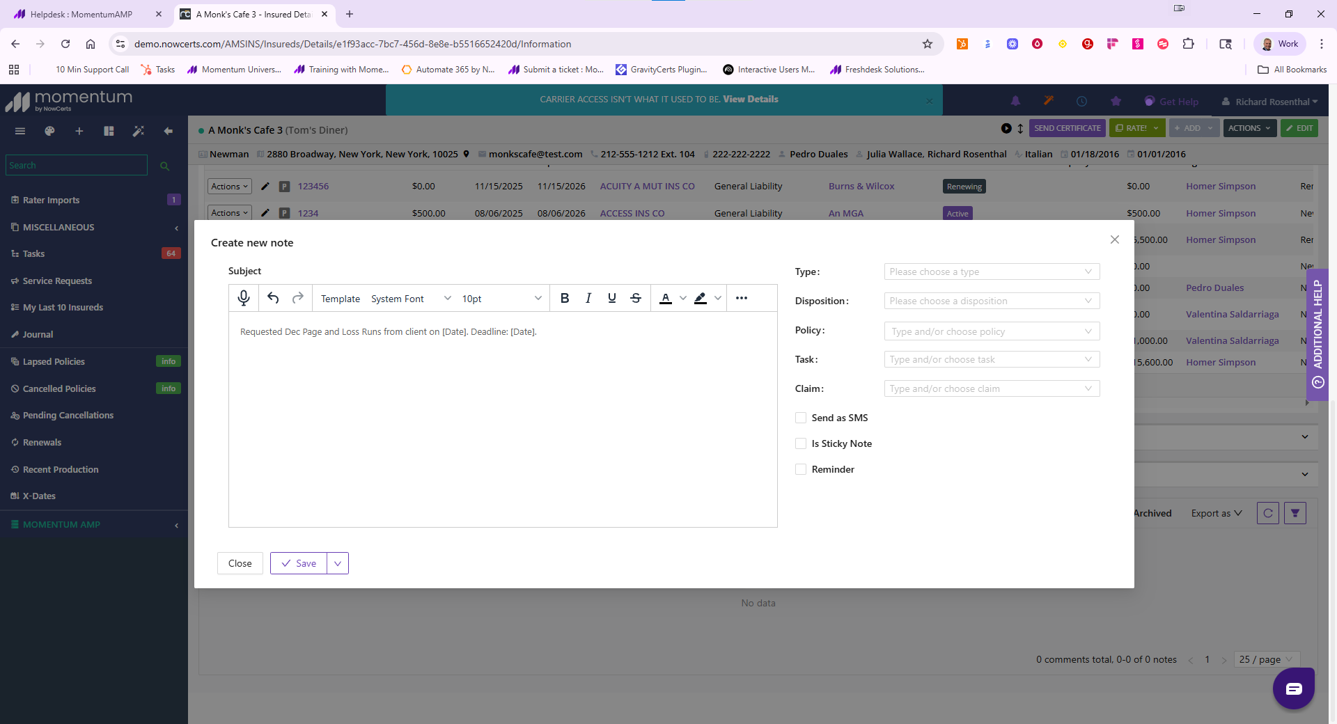 “Requested Dec Page and Loss Runs from client on [Date]. Deadline: [Date].”