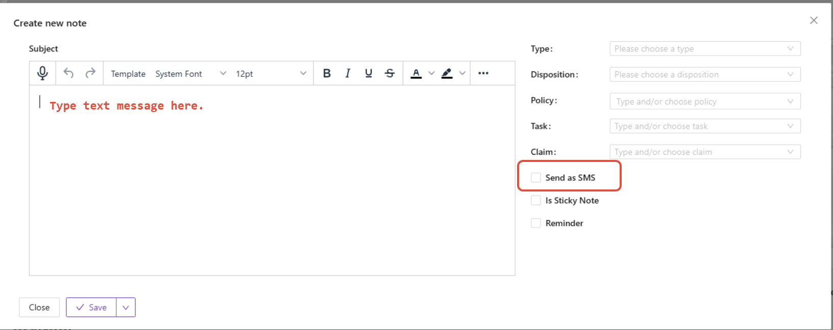 • The message will send from your connected RingCentral number, and both the note and text log will save in the insured’s Activity History.