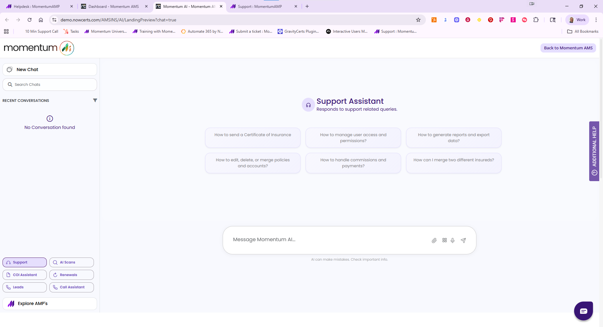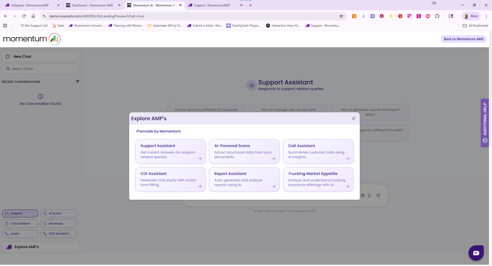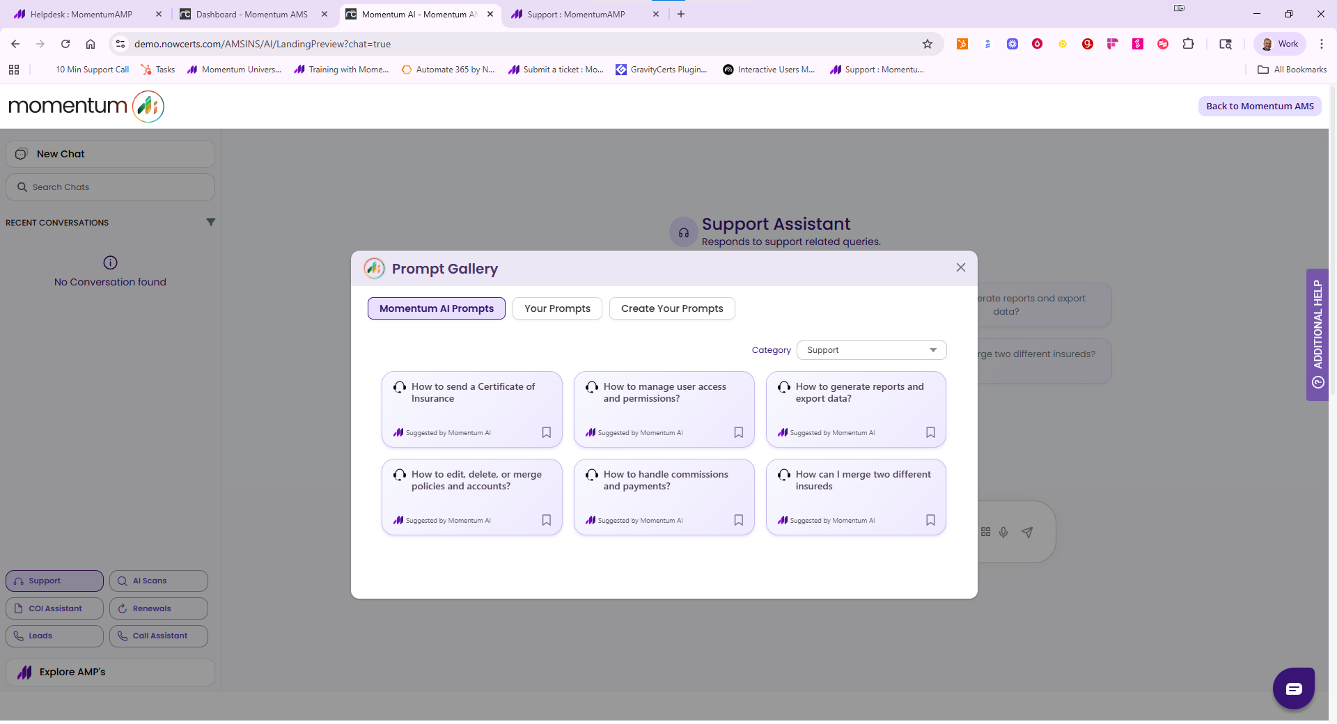 The Momentum AI Center is your agency’s smart assistant inside Momentum AMS. It helps reduce manual work by answering questions, remembering prompts, processing uploads, and even creating or updating records in your system. This article highlights some of the powerful capabilities available within the AI Center.
