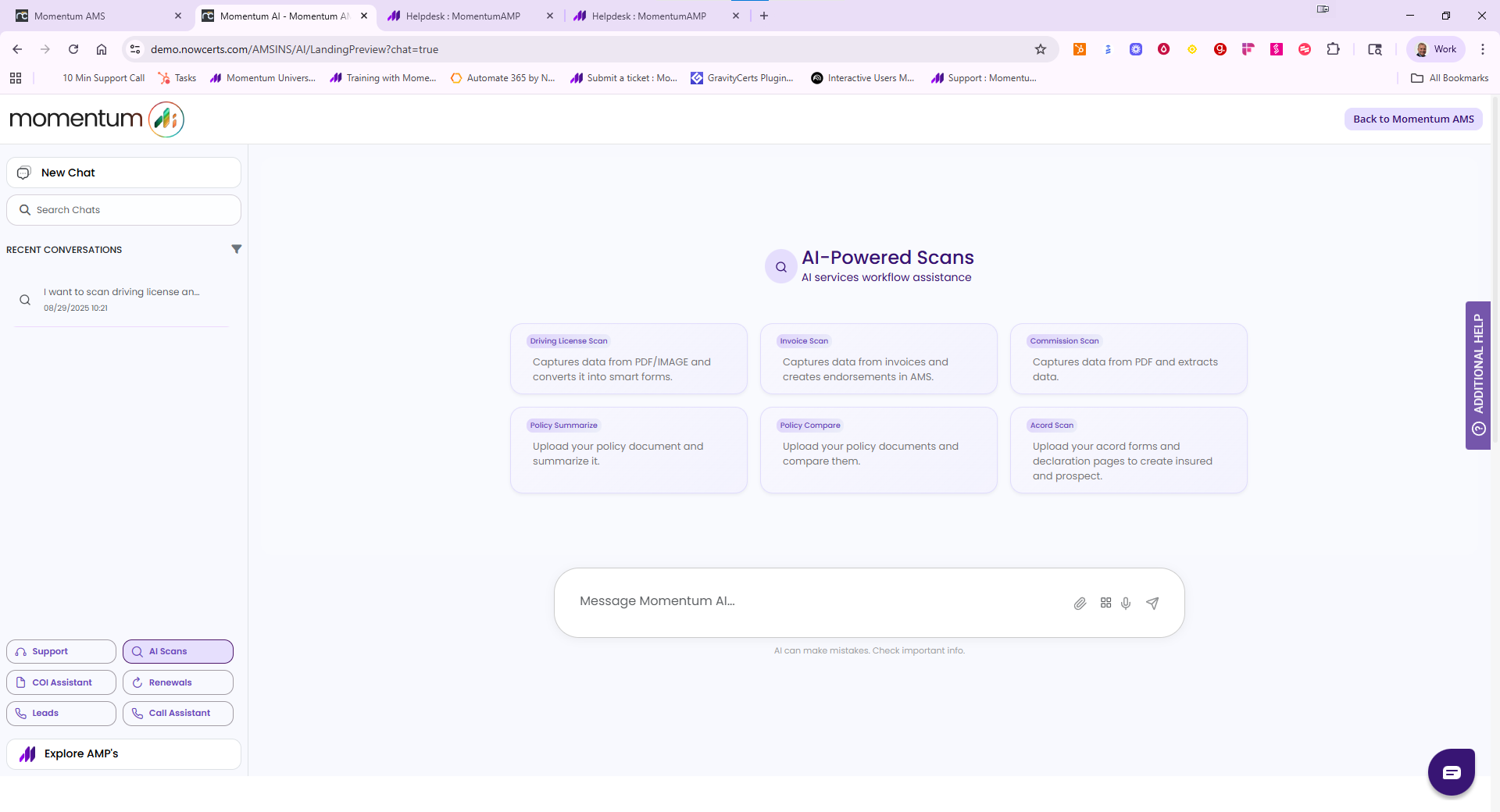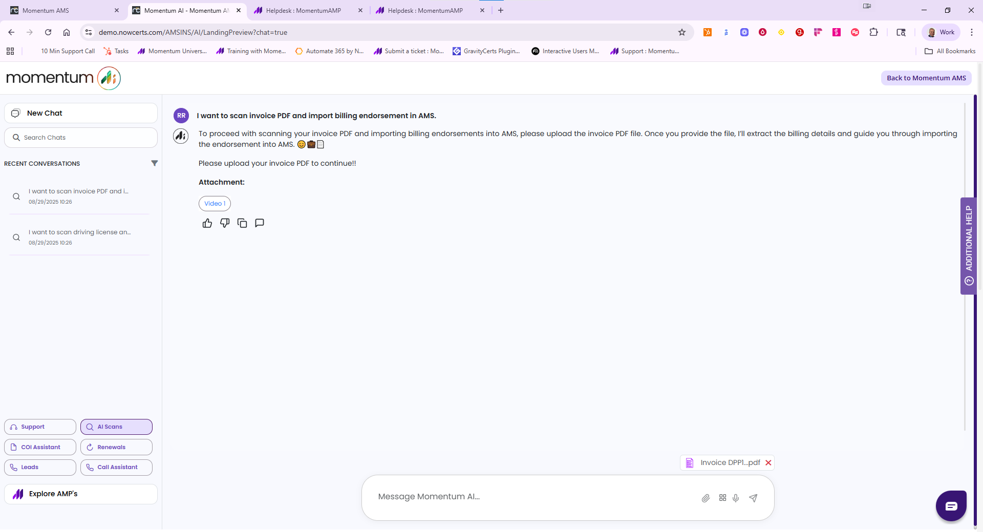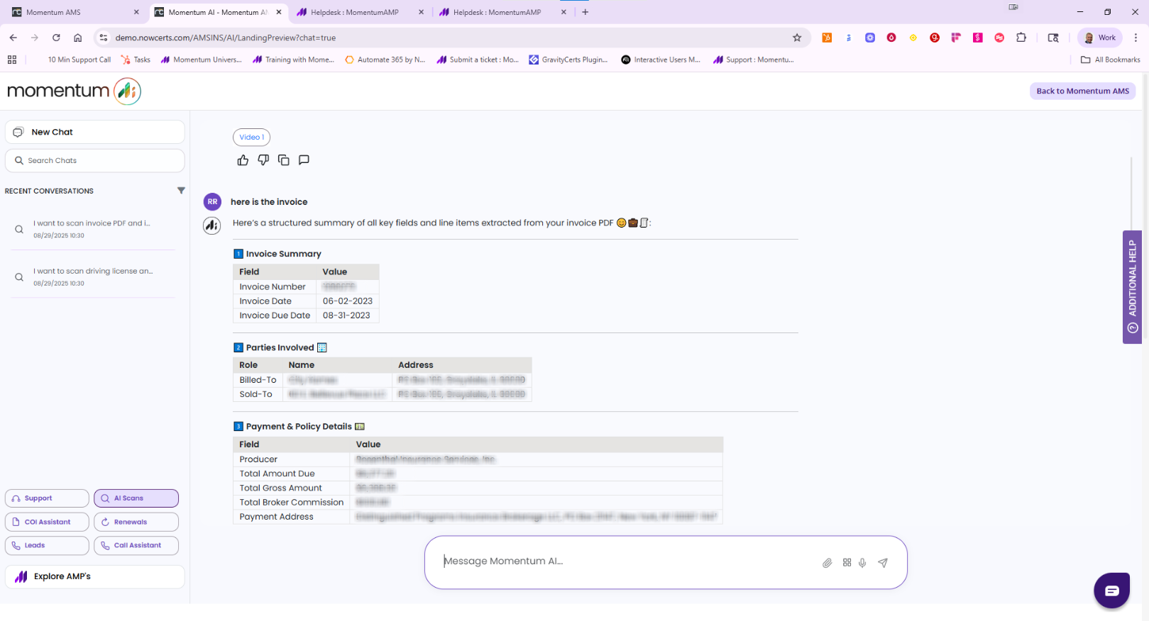 The Invoice Scan feature in Momentum AI allows you to upload invoices (PDF or image) and automatically extract structured data. This data can then be used to create endorsements or update billing information in Momentum AMS, reducing manual entry and ensuring accuracy.