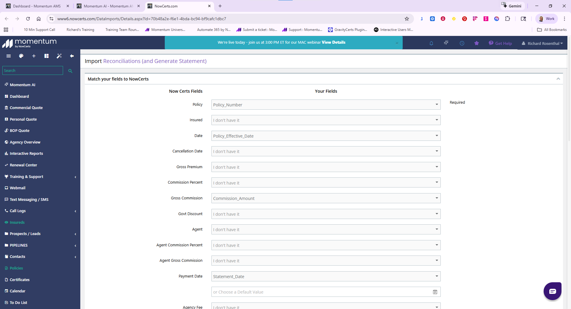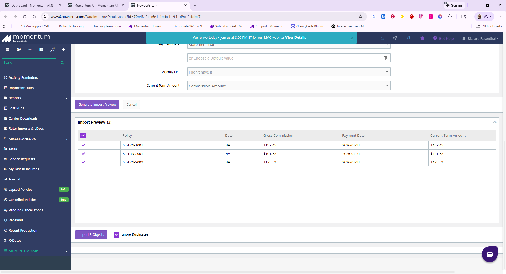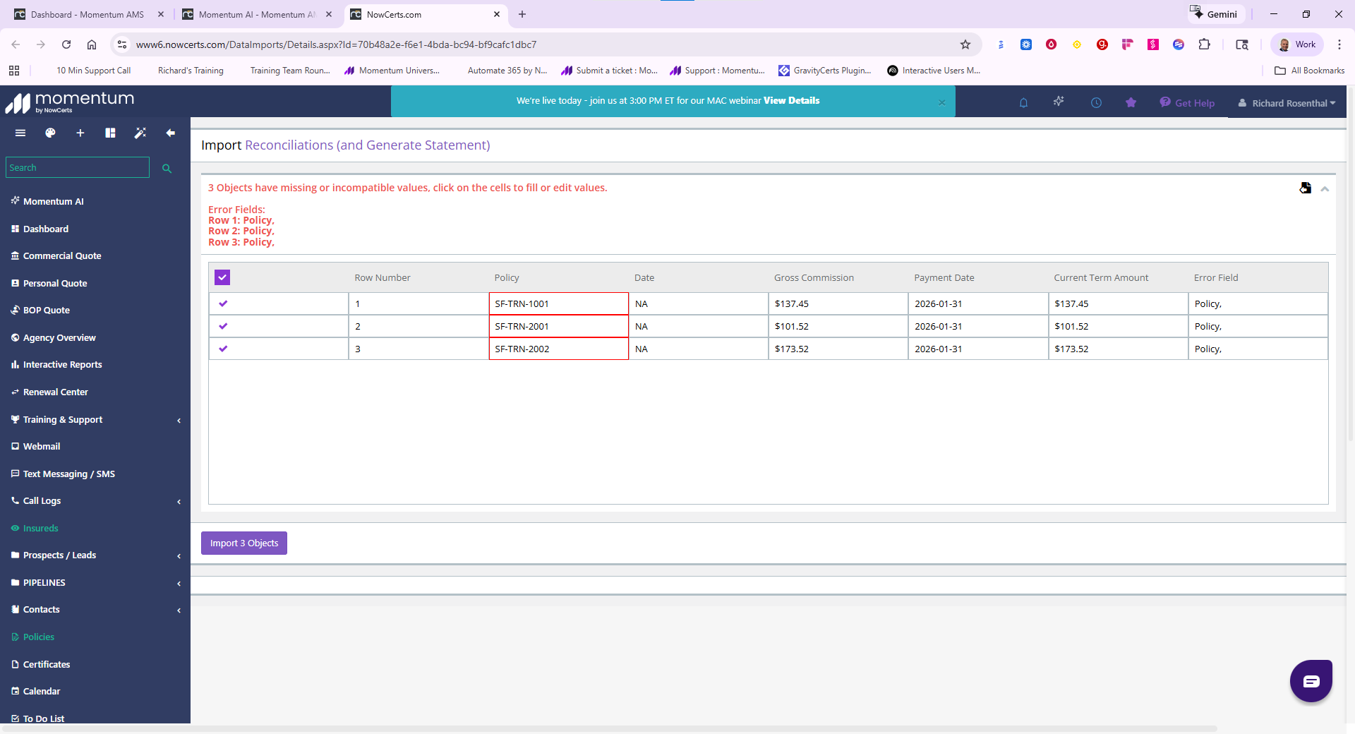 The Commission Scan feature in Momentum AI allows you to upload carrier commission statements in PDF format and automatically extract the data into a structured CSV file. Once processed, the CSV can be imported and reconciled directly inside Momentum AMS, reducing manual entry and ensuring accuracy in your commission records.
