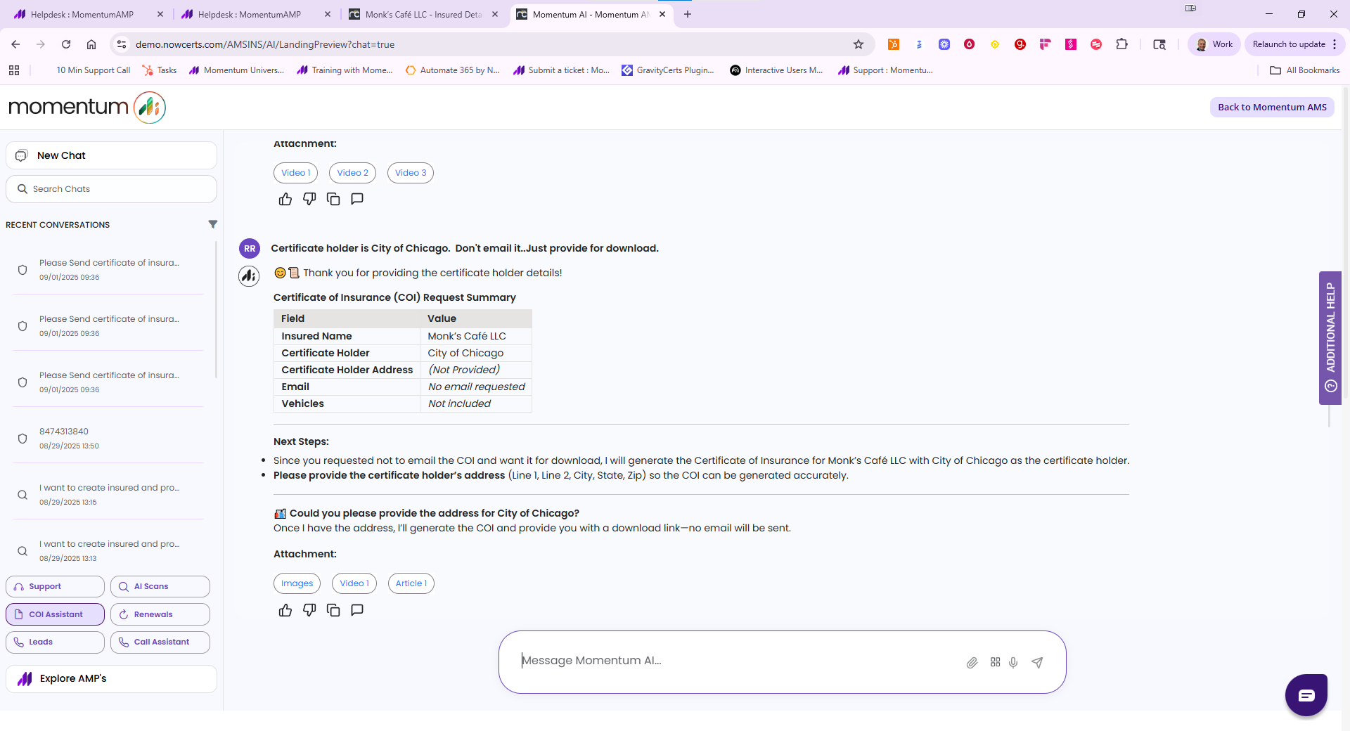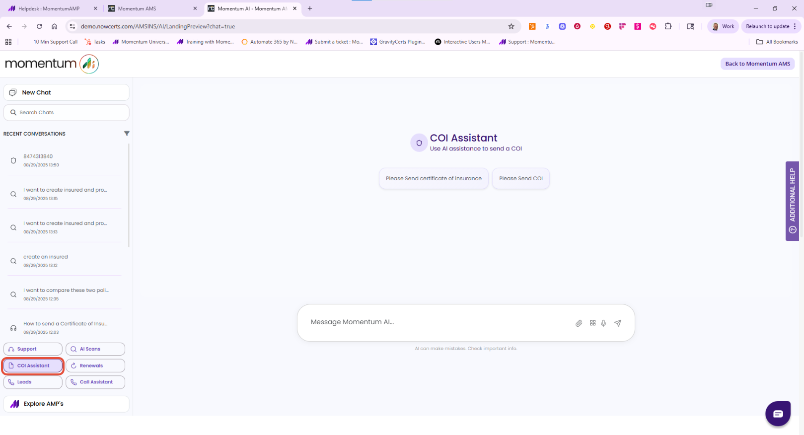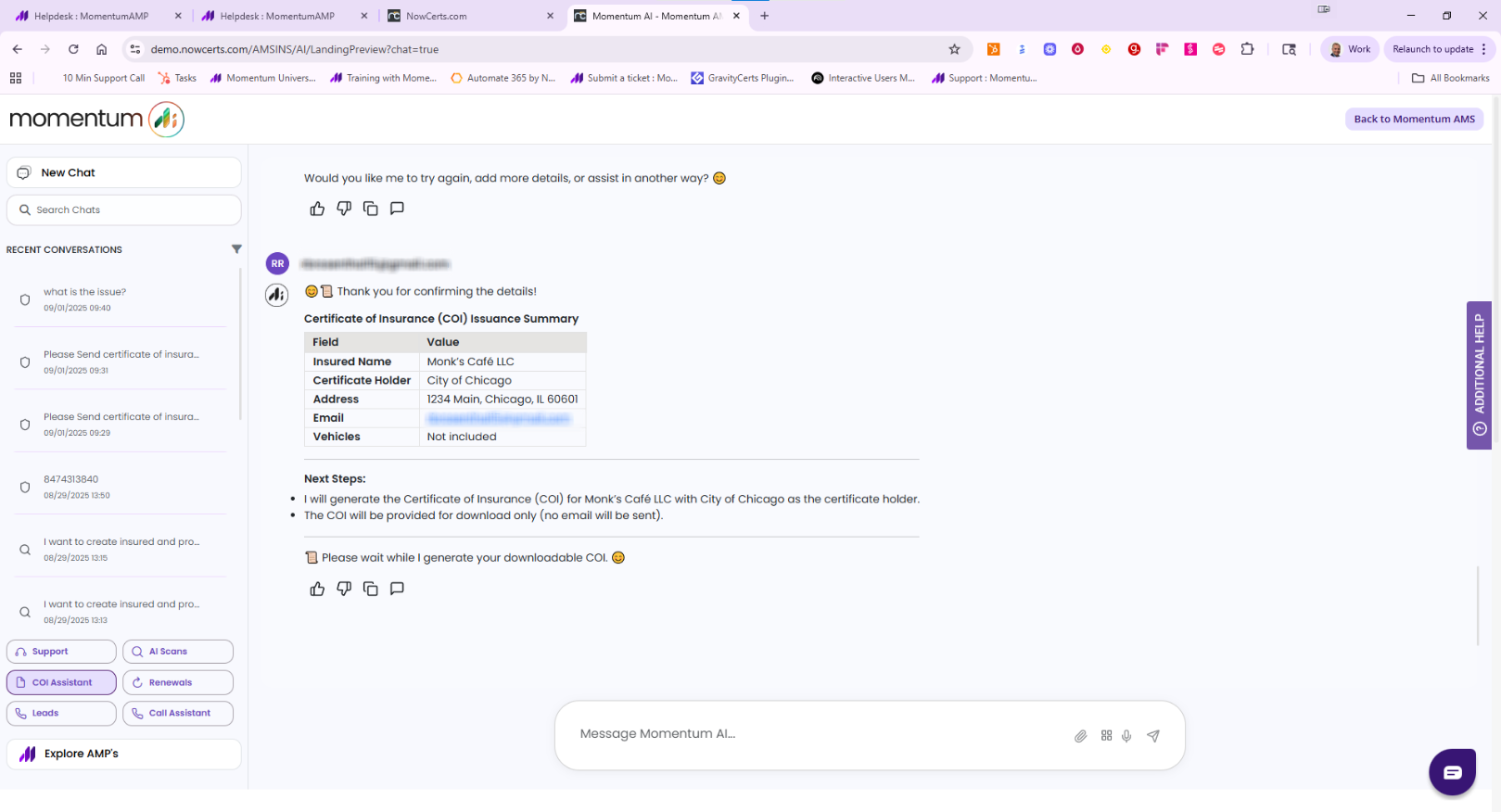 The COI Assistant in Momentum AI helps you issue Certificates of Insurance (COIs) faster by combining AI prompts with your AMS records. Instead of navigating multiple menus, you can simply request a certificate through the assistant, attach the correct holder, and send it directly from Momentum AMS.