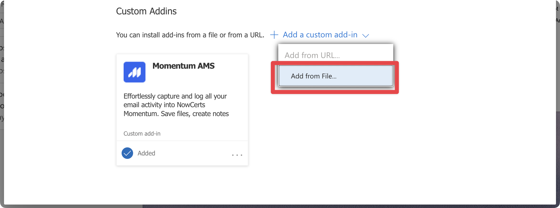 Scroll down and click + Add a custom add-in → Add from file…