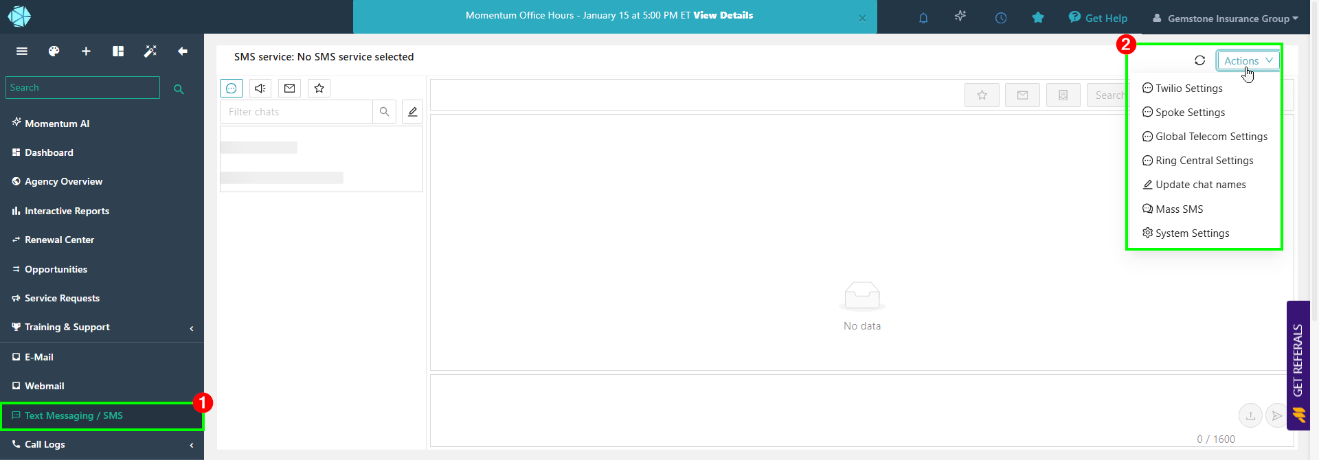 1. In the main Momentum AMS, find Text Messaging / SMS in the left navigation bar.