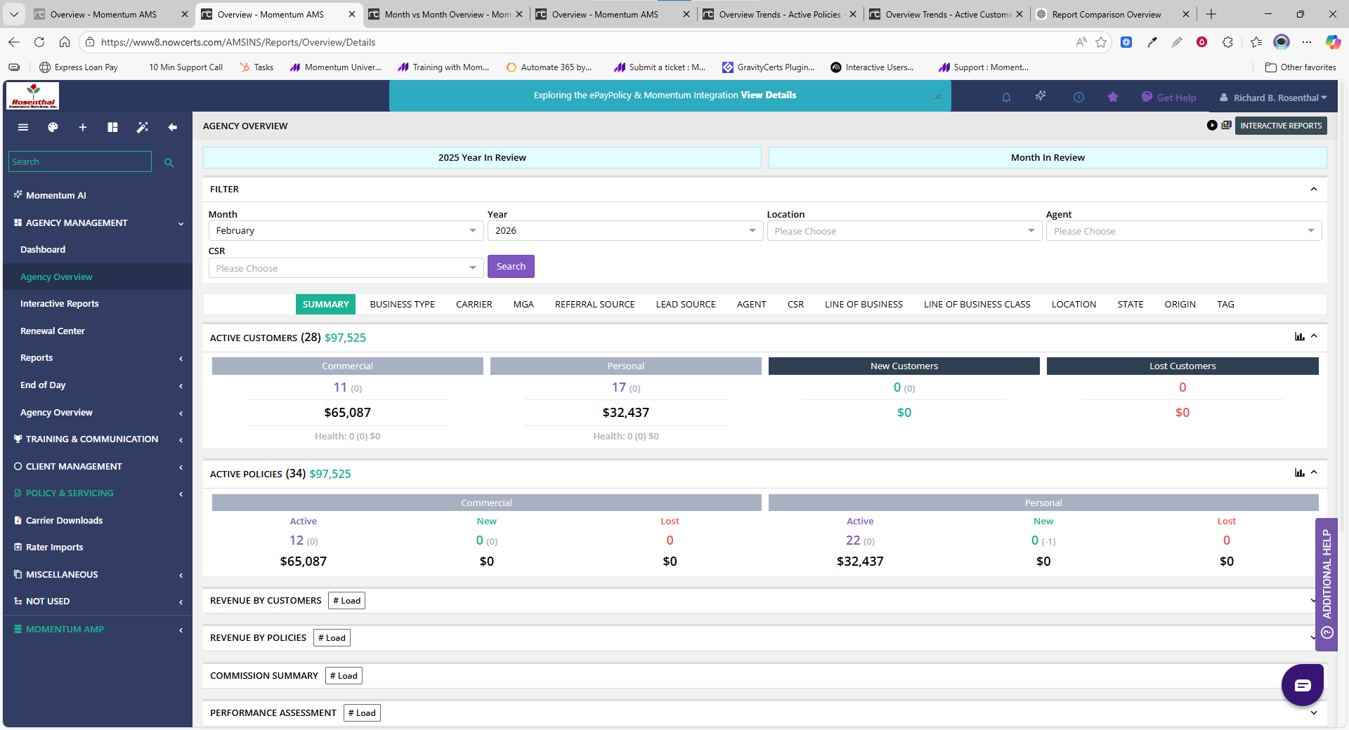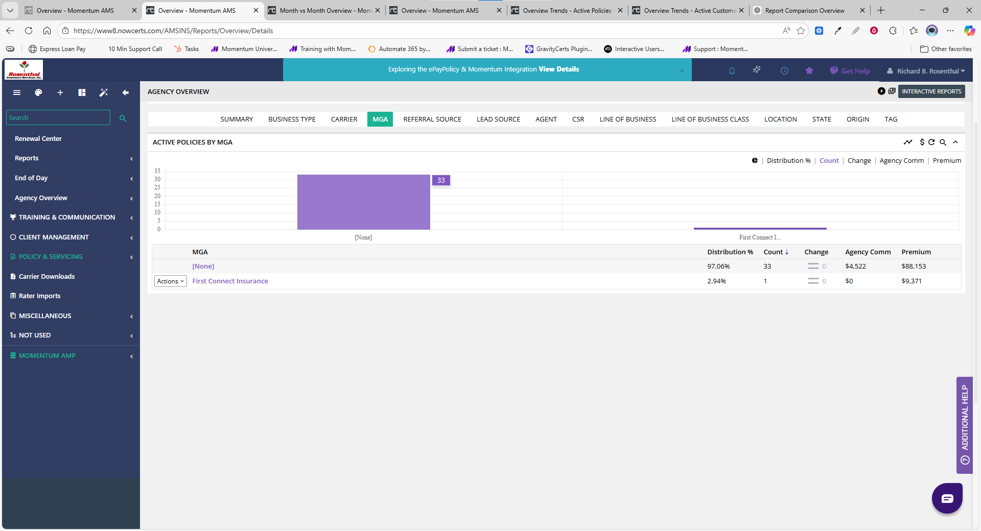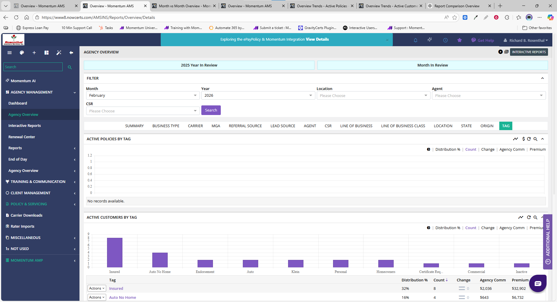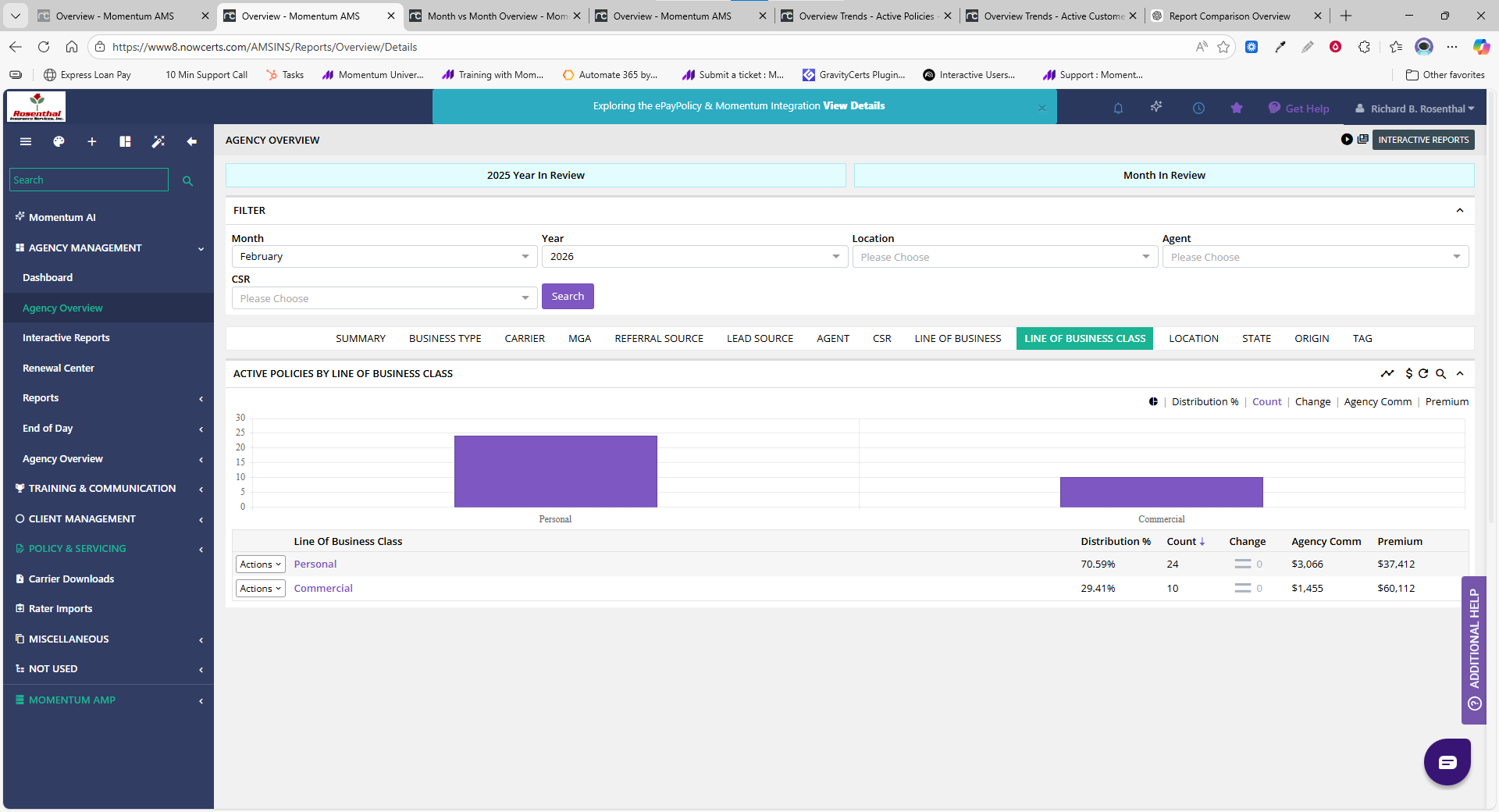 The Agency Overview is a book-of-business visibility dashboard within Momentum AMS. It allows you to view your agency’s current book from multiple perspectives.