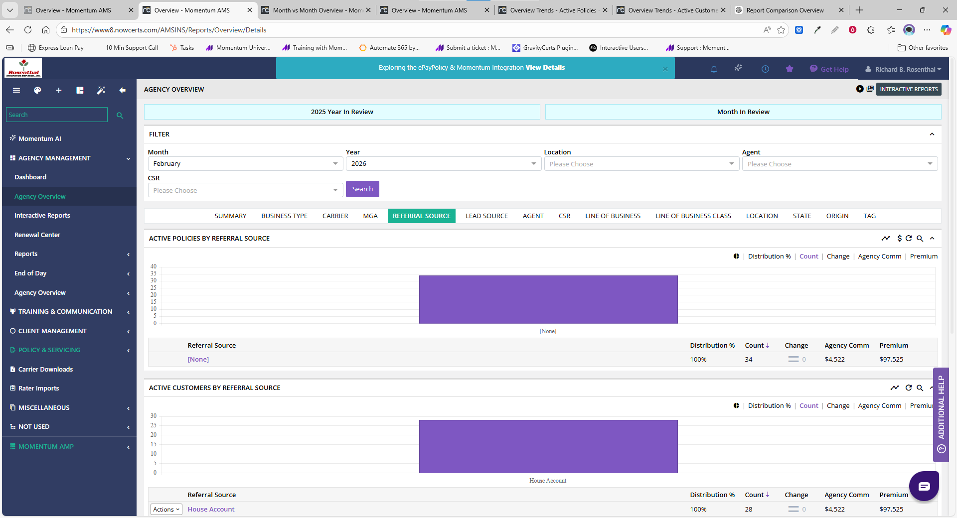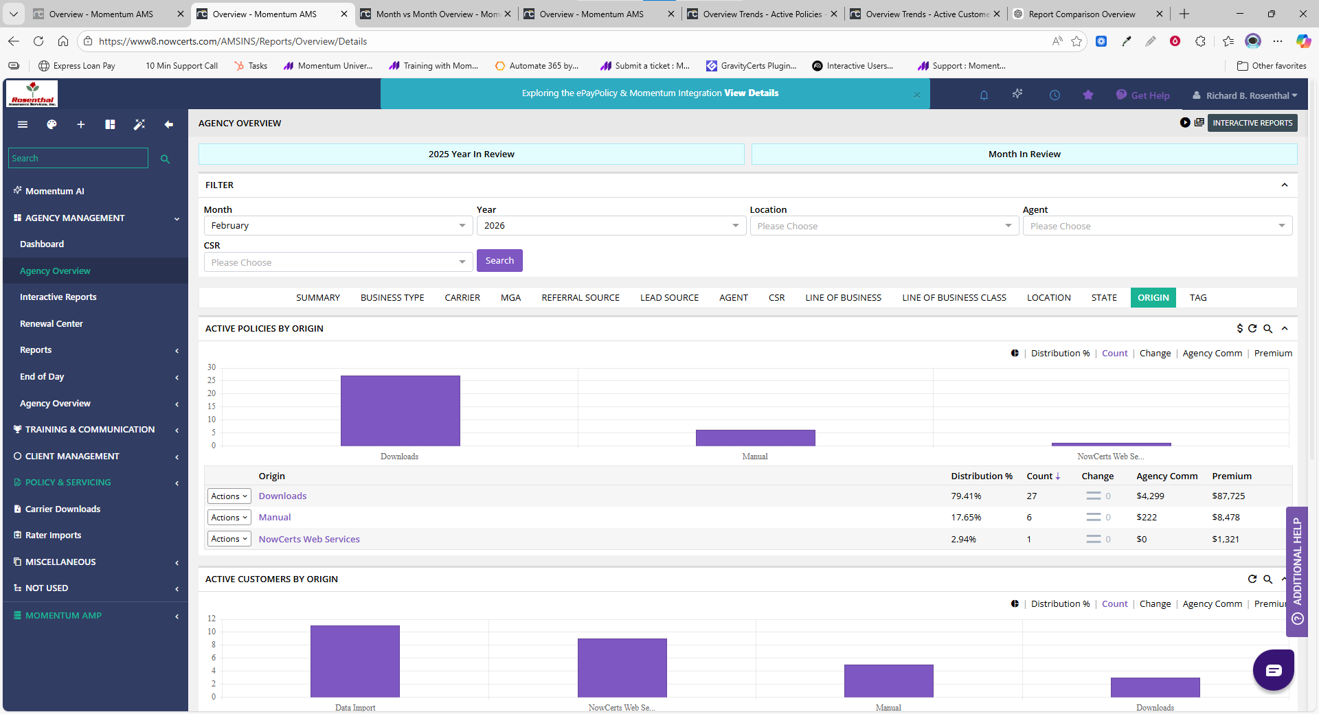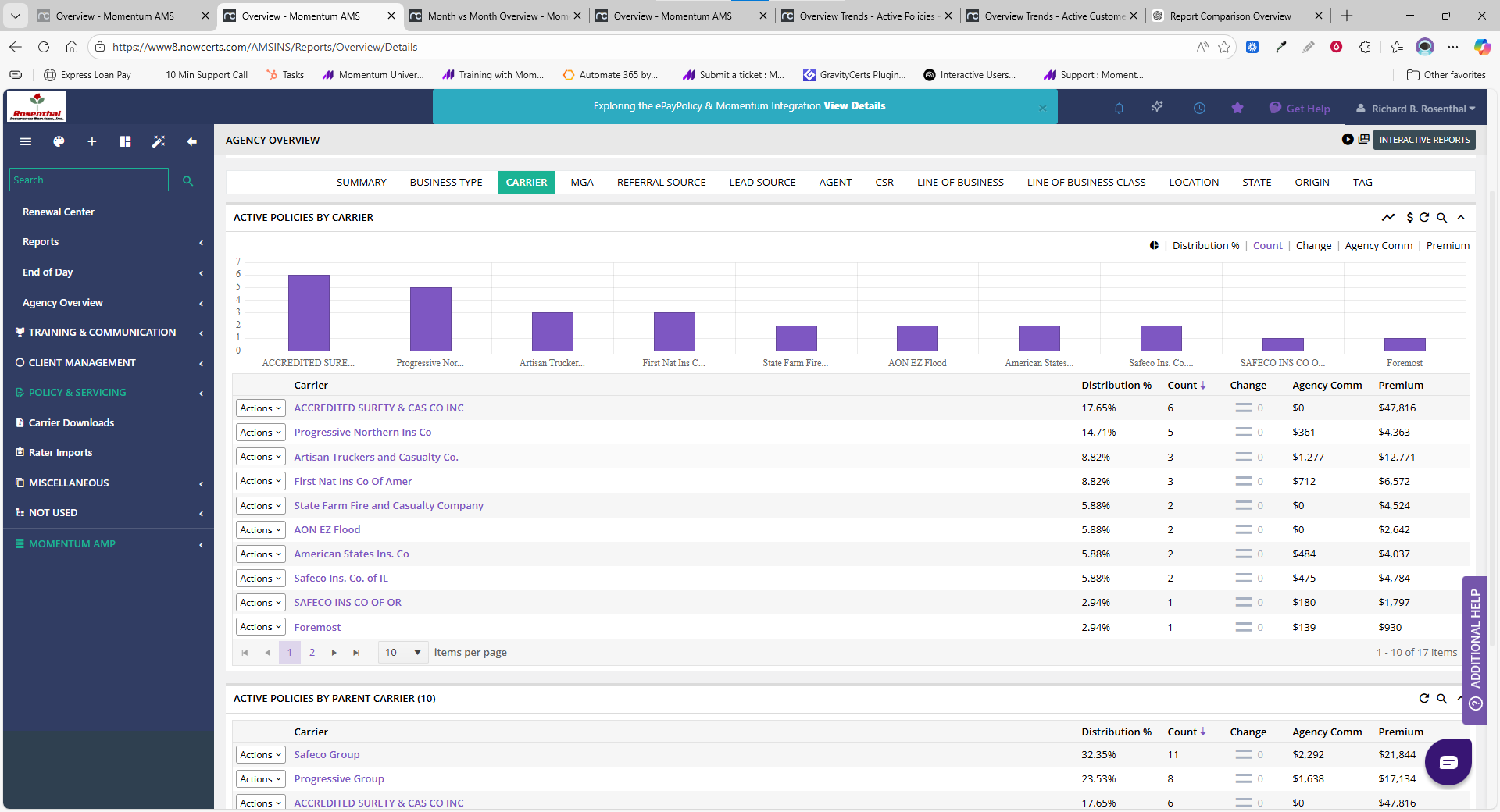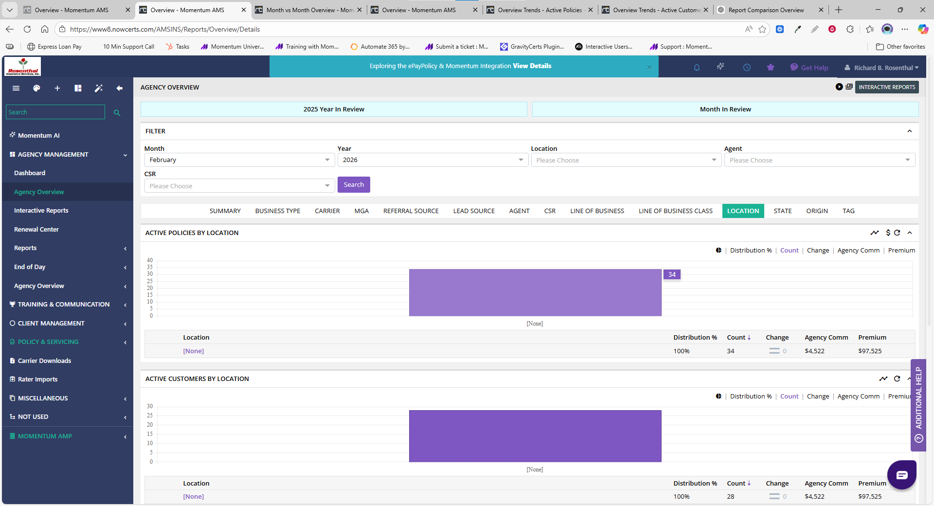 The Agency Overview is a book-of-business visibility dashboard within Momentum AMS. It allows you to view your agency’s current book from multiple perspectives.